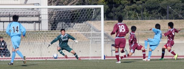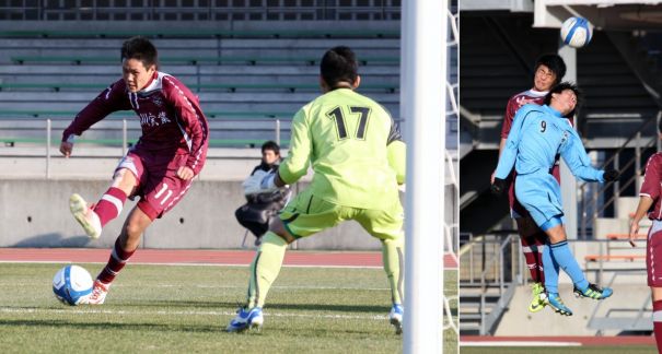 上:下段左写真/2点リードされている旭川実業は前半26分、FW山本(11番)が左サイドをドリブルで駆け上がり徳島市立GK山岡(17番)をかわしてゴールを決め1点を返す