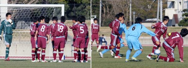 上:上段左写真/前半14分徳島に先制ゴールを決められ集まって話し合う旭川実の選手たち