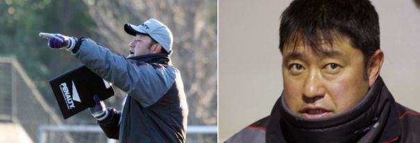 上:下段左写真/前半31分選手たちに檄を飛ばす旭川実の富居徹雄監督