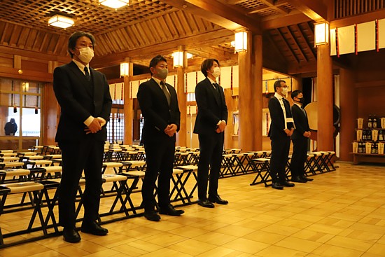 最後に1月16日午後4時から行われた「2021シーズン 必勝祈願 実施報告」=写真=奥から石屋製菓株式会社代表取締役 石水創氏、(株)コンサドーレ代表取締役社長CEO 野々村芳和氏、チームを代表したキャプテン宮澤裕樹選手。取締役GM 三上大勝氏、取締役CMO 中嶋晋一郎氏、北海道神宮の大広間では「寂し過ぎた」。
