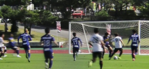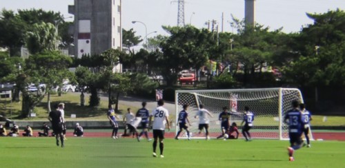 上写真/左端の小柏のパスを受け、9番FW金子が沖縄SVゴール前にせまる