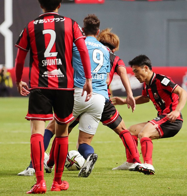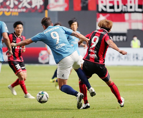 上写真/横浜FCにJ2千葉から新加入したFWクレーベ(左の9番)と、昨季ベルギーに移籍した鈴木武蔵の後を継いで大卒2年目にしてエースナンバーを背負う札幌MF金子(右の9番)が競り合う。最初はクレーベが触れたが、金子が体を入れる