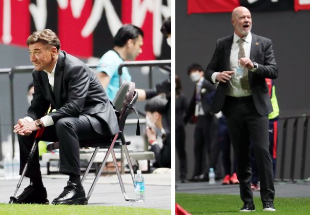 上:左側写真/後半24分、札幌MF金子が倒されたシーンで、清水主審(後方)がVARで確認する間、椅子に腰かけて待つペトロビッチ監督