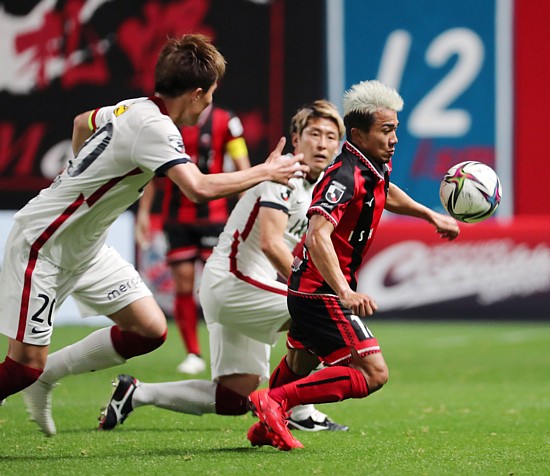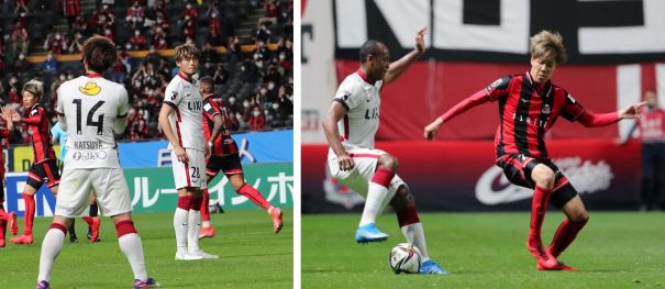 上:右側写真/前半42分、札幌DF田中(右)が鹿島の名手レオ・シルバと相対する、激しいマッチアップにもかかわらず、タンチョウのダンスのように優雅だ。田中は26分に今季初ゴールとなる1点を決め、代表チームで負傷して出場できなかった鬱憤をはらした