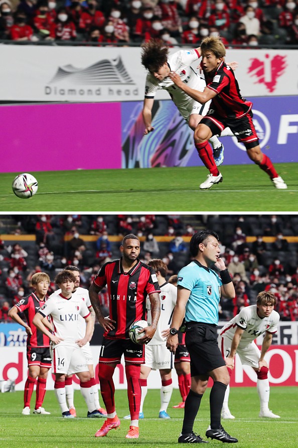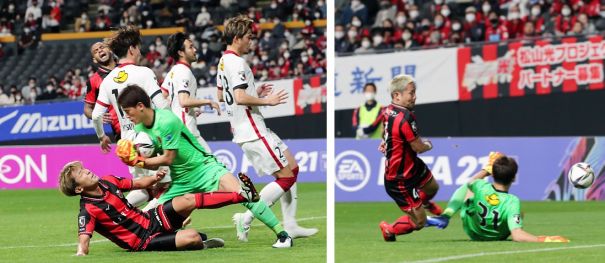 上:上段写真/後半20分、札幌MF金子(右)がDF岡村からのパスを受けて右サイドを駆け上がり、ペナルティー・エリア付近で鹿島DF永戸と交錯して倒されPKを得る。微妙な位置でVAR判定となりPKが確定するまで時間がかかった