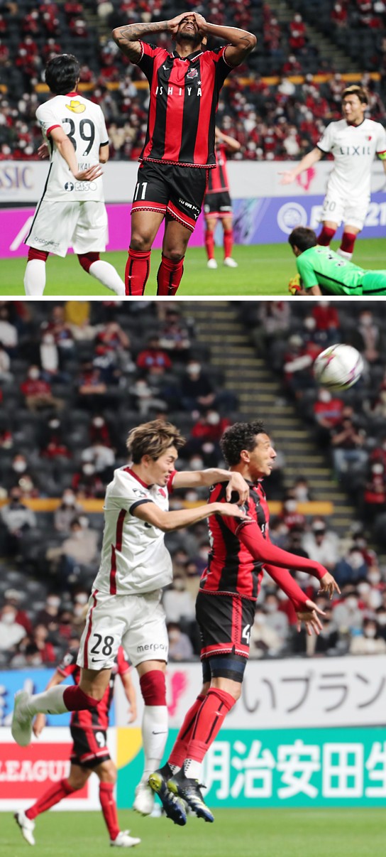 上:下段写真/後半19分、札幌FWジェイ(右)と鹿島DF町田(28番)が、左からのFKのボールを奪い合う、ジェイはコロナの影響で今季初登場