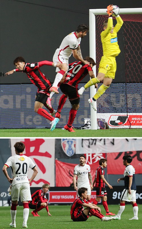 上:上段写真/後半追加タイム2分、鹿島MF荒木の右からのクロスを札幌GK菅野(右)がFWエヴェラウドと競りながらキャッチ、その左DF岡村(50番)、左端柳。この試合再三の危機にGK菅野が攻守で引き分けに貢献した