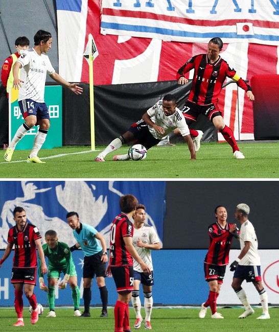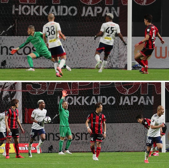 上:上段写真/後半35分、横浜FMのFWオナイウ阿道(45番)が同点ゴールを決める、その左FW前田(38番)、左端札幌GK菅野、右端DFキム・ミンテ