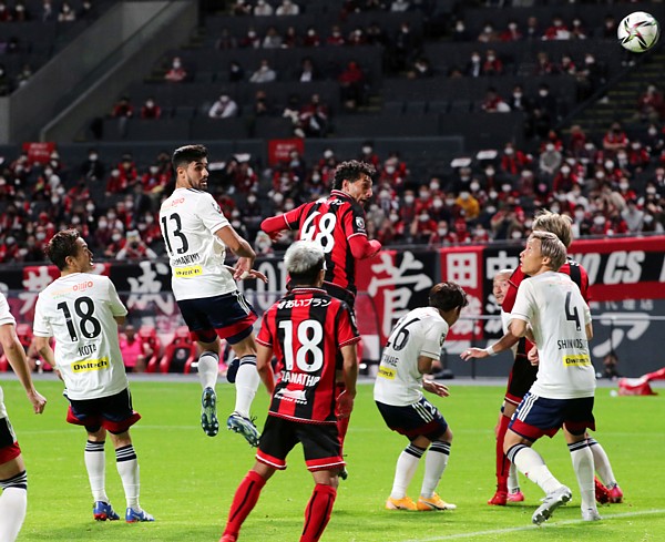 試合は32分、マリノスMFジュニオールが高嶺に遅れてタックル、イエローカード。この後、菅、福森、チャナチィップが、好機をつかむが、アディショナルタイム3分も過ぎスコアレスドローで、ハーフタイム。