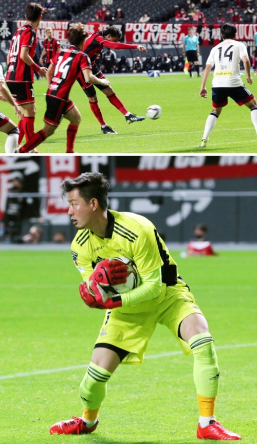 上:下段写真/後半追加タイム8分、札幌FWジェイのシュートをしっかりキャッチする横浜FMのGK高丘