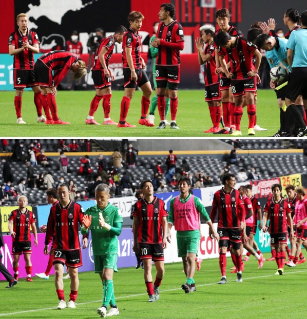 上:下段写真/横浜FMに逆転負けを喫し、しょんぼりとサポーターへのあいさつに向かう札幌の選手たち、左からMF菅(4番)、DF柳、MF荒野(27番)、GK菅野、MF宮澤(10番)、GK大谷、FWジェイ(48番)、アンデルソン・ロペス、DFキム・ミンテ、MF青木(28番)、DF岡村、MF金子