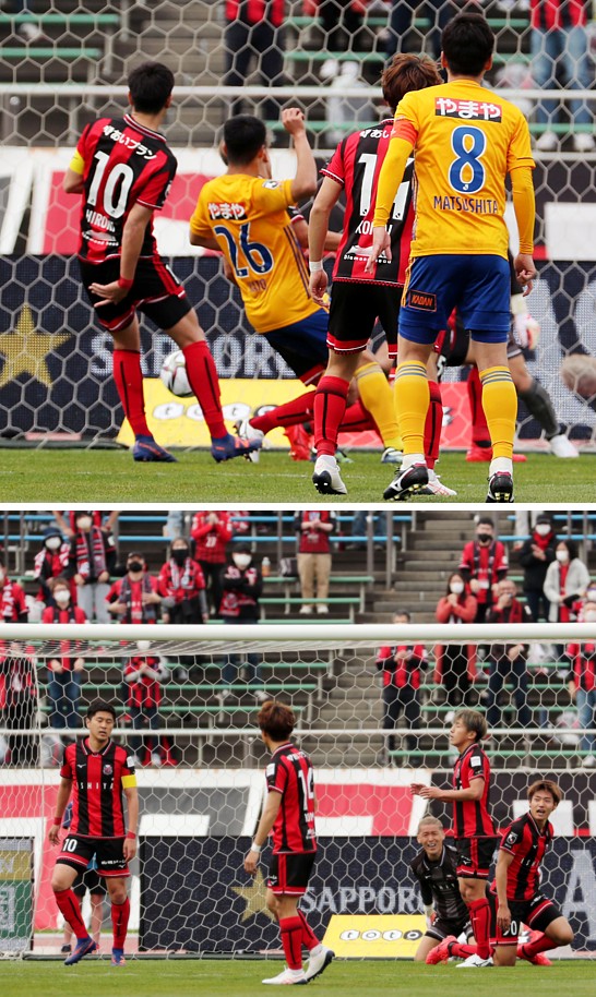 上:左側写真/後半10分、チャナティップのスルーパスを受けた札幌MF小柏が同点となるプロ入り初ゴールを決める