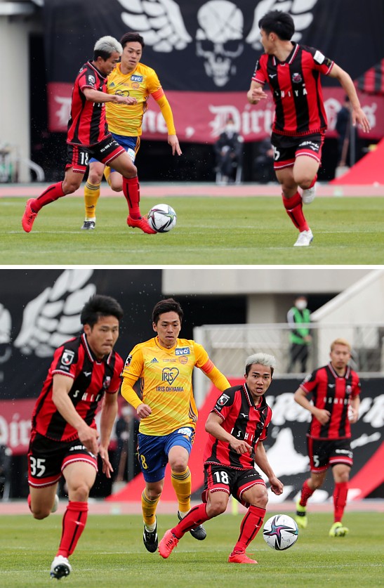 上:上段写真/後半10分、札幌MFチャナティップ(18番)が自陣でボールを奪い、ドリブルで駆け上がる、右は後半はじめから途中出場したMF小柏、中央仙台MF松下(8番)