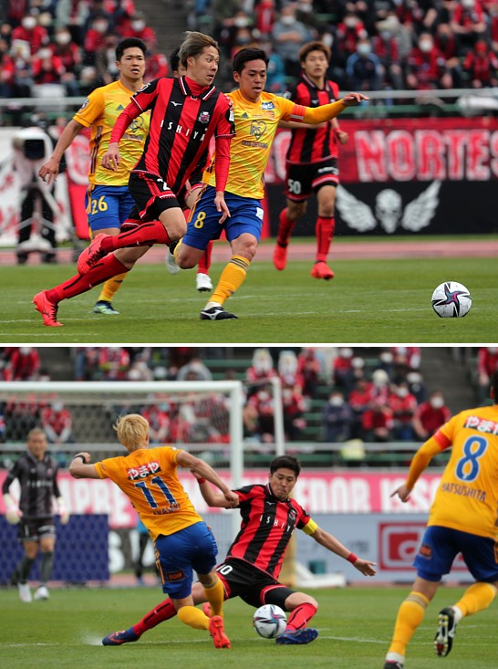 上:下段写真/後半18分、札幌MF宮澤(10番)が仙台FW赤崎(11番)に猛然とタックル、4試合勝ちなしの札幌のキャプテンとして闘志を見せた