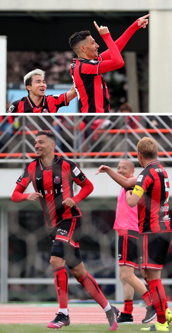 上:上段写真/後半43分、札幌FWジェイが決勝ゴールを決めゴール裏サポーターにアピール、駆け寄ったMFチャナティップが本当に嬉しそう
