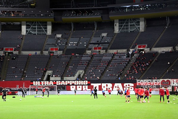 上写真/鹿島ゴールサイドから撮影、本来はコンサドーレの熱烈サポーターの席のはずが、記者席などのある正面スタンドになっている