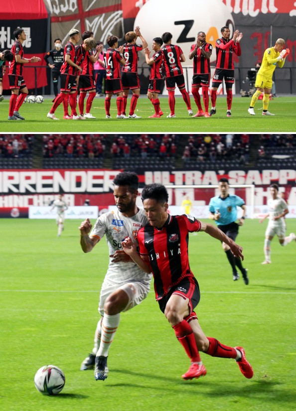 上:上段写真/後半10分、得意の左足で開幕戦以来となるゴールをあげた札幌MF金子が、清水FWカルリーニョス・ジュニオ(10番)とDF鈴木(50番)の間を笑顔で走り抜ける