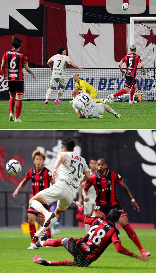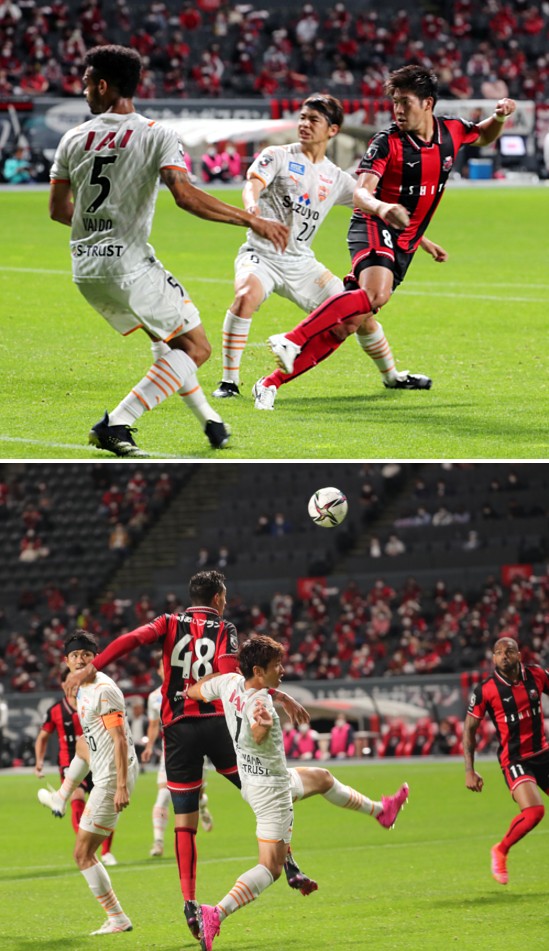 上:下段写真/後半6分、札幌DF福森の左サイドからのパスをFWジェイ(48番)が清水DF片山(7番)と競りながら、右足の太ももに当て落とし、MFアンデルソン・ロペス(右)の先制点となるボレーシュートを呼ぶ