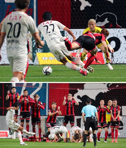 上:上段写真/後半追加タイム3分、札幌ゴール前に突進する途中出場の清水FW指宿(27番)を札幌DFキム・ミンテ(右)がGK菅野の目前で倒し、一発レッドカードで退場、左清水MF中村(20番)