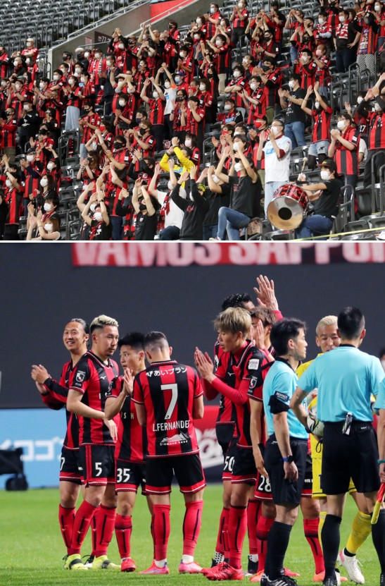 上:上段写真/後半22分、2−0と試合を有利に進める札幌が、FWジェイが倒されてFKを得た好機に、ゴール裏熱烈サポーターのボルテージはいやがうえにも燃え上がる、太鼓と手拍子で熱い声援を送る