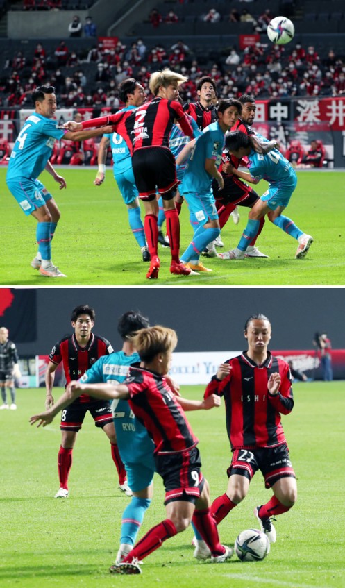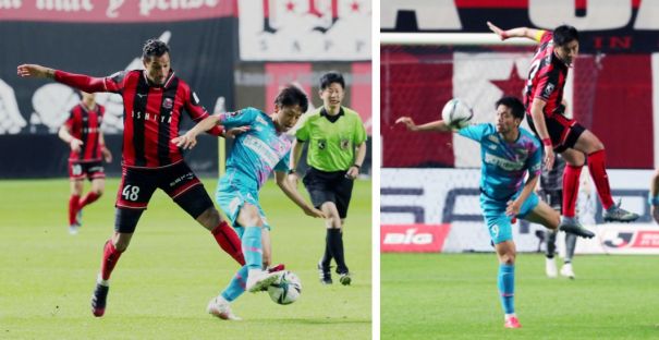 上:左側写真/前半2分、札幌FWジェイ(48番)が鳥栖MF松岡とマッチアップ