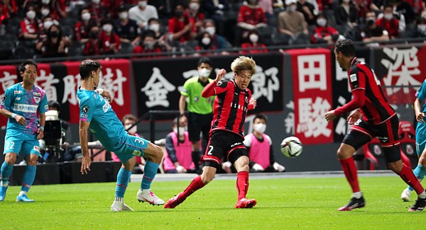 上写真/前半12分、札幌MF菅が左サイドからシュートするが、GKにキャッチされる。菅は後半13分にゴールを決めて喜んだが、直前のパスを出したMF金子の位置がVAR判定でオフサイドとなり、幻のゴールとなりアンラッキーだった