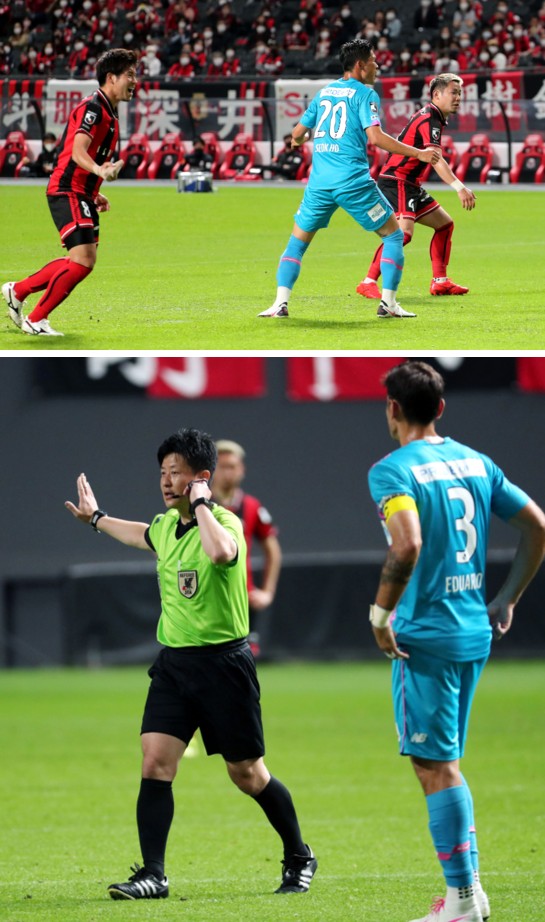 12分過ぎに「大波乱」。13分札幌は右サイドの田中駿から金子へ展開、中央の背番号4菅がシュート、GK朴は動けずネットを揺らす。主審はゴールインのしぐさを見せた。「決まった!」小躍りして喜ぶコンサド陣営。14分、小屋主審が耳に手を当ててシグナル・VARのチェックを促す。再び主審はバックスタンド側のタッチラインに向かって「オフサイド」、「ノーゴール」の判定。金子の「違います」のジェスチュア―も受け入れられず、ミシャ監督やスタッフ、選手らはベンチ前で「大暴れ」。