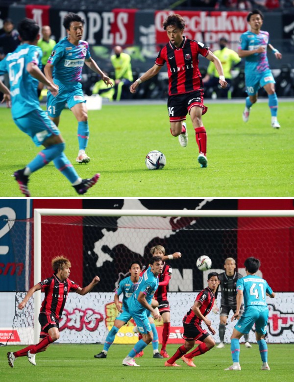 上:上段写真/後半19分、札幌MF駒井(14番)がドリブルで駆け上がり、鳥栖DF中野(左)とMF松岡(41番)の間を切れ込み、シュートまでいったが左へはずす