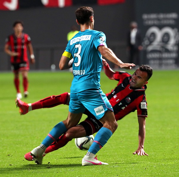 19分「一件落着」。駒井がドリブル突破、シュートを放つがブロックされCK。福森のキックは金子に渡るがブロックされる。再びCK。福森今度は直球のインカーブ。DFエドゥアルドにはじき返される(29分飲水タイム)。