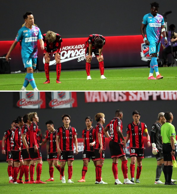 上:下段写真/スコアレスドローに終わり、疲れ切ってぶぜんとする札幌の選手たち