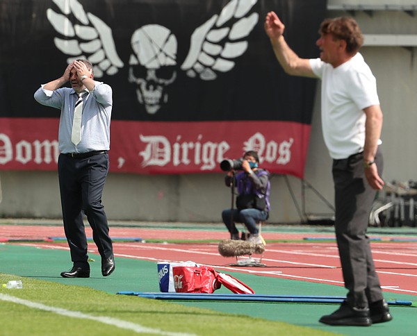 上写真/後半36分、札幌MF菅と競り合った横浜FMのMF水沼がファールをとられ、思わず頭に手をやる横浜FMのアンジェ・ポステコグルー監督(左)と、手を振り上げ選手を鼓舞する札幌のペトロビッチ監督(右)