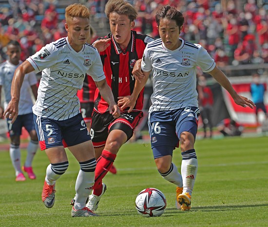 上写真/前半追加タイム2分、札幌MF金子(9番)が横浜FMのDFティーラトン(5番)とMF渡辺(26番)の間を割って入るようにボールを奪いに行く