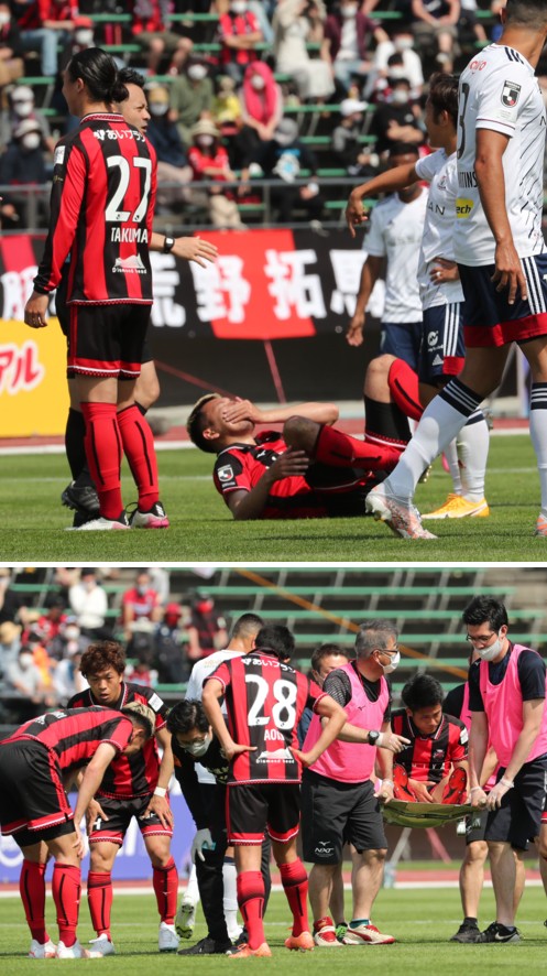上:上段写真/後半15分、札幌DF福森が2分前に味方同士のMF高嶺と激突、口を押えたままなかなか立ち上げれない、周りが心配そう
