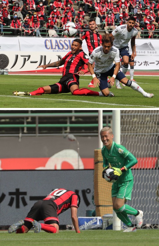 上:下段写真/前半42分、札幌MF菅(右)の得たPKを荒野(27番)が蹴ったが、GKに止められ追加点を逃す、左端DFチアゴ・マルチンス(13番)