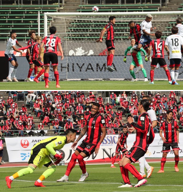 上:下段写真/前半39分、札幌右CKからの攻撃でMF小柏(35番)がジャンプするが届かず、結局誰も触れずゴールラインを割る
