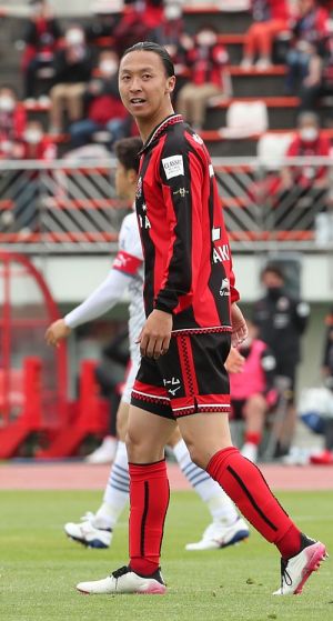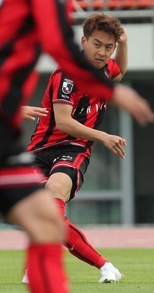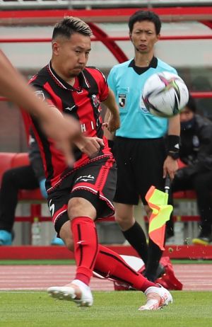 左写真/後半40分、クロスを上げる札幌MF菅
