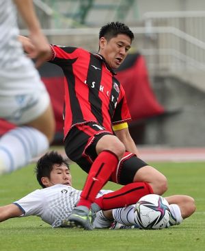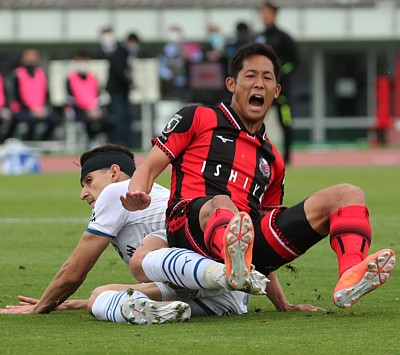 右写真/前半28分、MF宮澤が大分MF井上のタックルを受けるが闘志満々、宮澤はこの試合でチームの通算出場記録を415試合とし、これまでの砂川誠の記録に並んだ