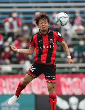 上写真/後半追加タイム3分、ハイボールをヘディングで返して目でボールを追うDF田中駿汰