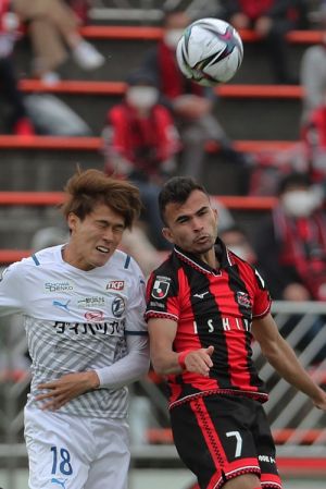 右写真/後半2分、GKからのボールを大分FW藤本(18番)とヘディングで競る札幌MFルーカス・フェルナンデス(7番)