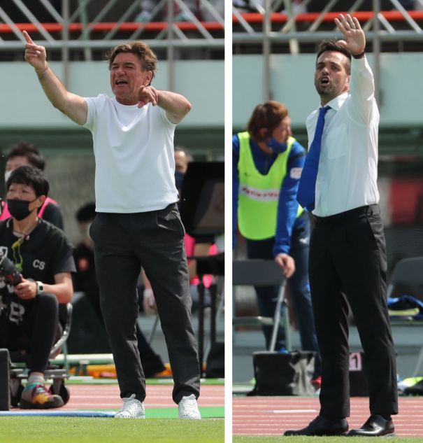 上:右側写真/後半31分、選手を鼓舞する徳島のダニエル・ボヤトス監督