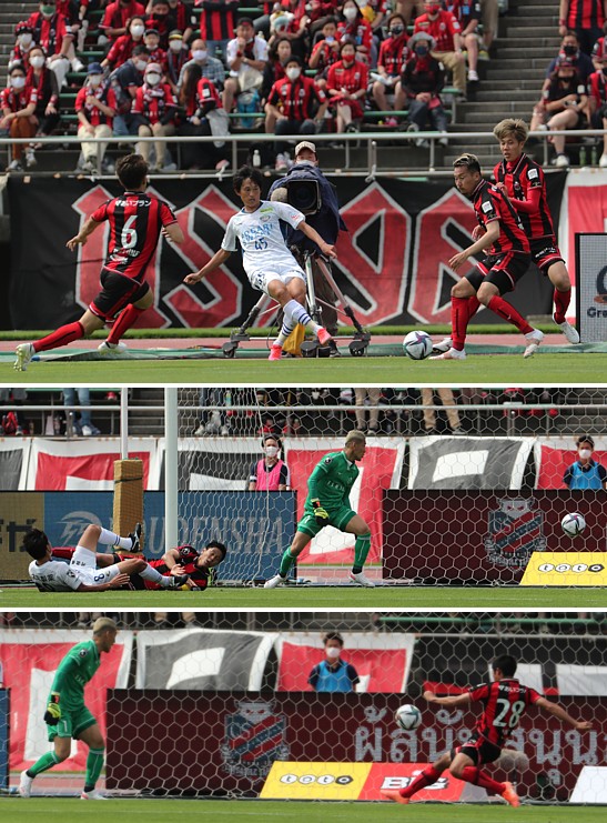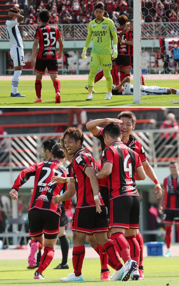 上:中段写真(連続2)/前半37分、徳島左サイドからMF杉森のクロスに岩尾(8番)が札幌MF宮澤をかわしてシュート、札幌GK菅野は「やられたー」と観念した様子