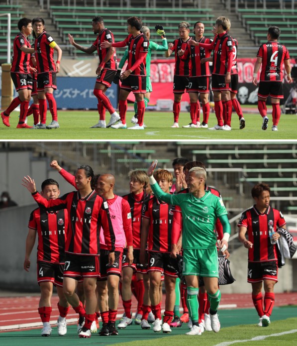 上:下段写真/徳島を破りサポーターへのあいさつに向かう札幌の選手たちには笑顔が目立つ、左からMF菅(4番)、荒野(27番)、小野、DF田中、MF金子(9番)、GK菅野(1番)、右端MF駒井(14番)