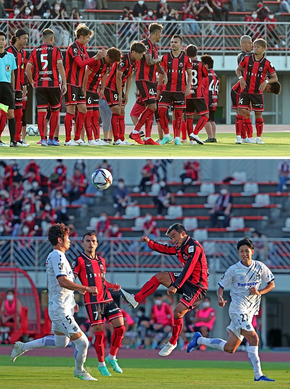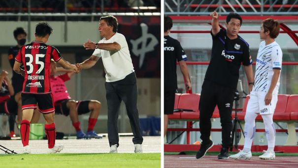 上:右側写真/前半34分、DF高尾の負傷で急遽出場する黒川(右)に入念に指示を出すG大阪の松波正信監督