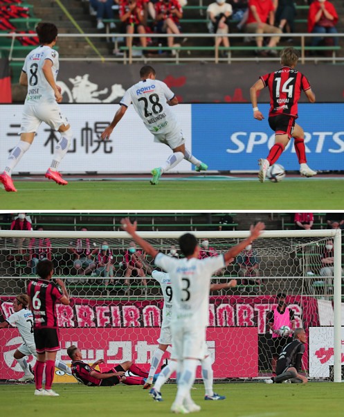 上:下段写真/前半29分、G大阪MF矢島(左端)が先制ゴールを決め、両手を上げて喜ぶDF昌子(3番)とFWレアンドロ・ペレイラ(9番)、カバーが一歩及ばなかった札幌DF福森(ピッチに倒れている)と悔しがるGK菅野(右端)、6番はMF高嶺。矢島はJ1での100試合出場の節目を飾った