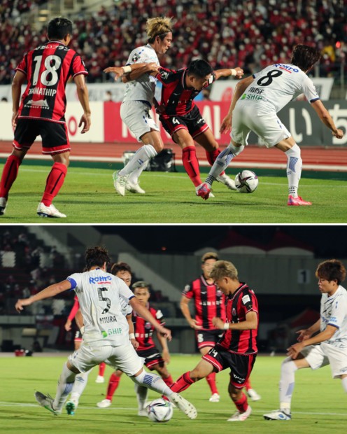 上:上段写真/後半20分、札幌MF菅(4番)がG大阪MF矢島(左)と小野瀬(8番)に挟まれるように突破を阻まれる、この後、熱くなった菅と矢島が小競り合いした
