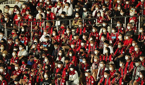 上写真/後半38分ごろ、聖地厚別のカクテル光線の中、熱戦を見つめる札幌サポーターたちのマスクが浮かび上がる