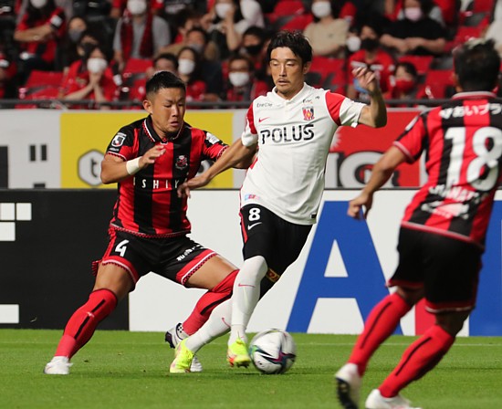 上写真/前半2分、コンサドーレのアカデミー出身の先輩後輩同士、先輩の浦和DF西(8番)に厳しく向かっていく後輩の札幌MF菅(4番)、右はチャナティップ