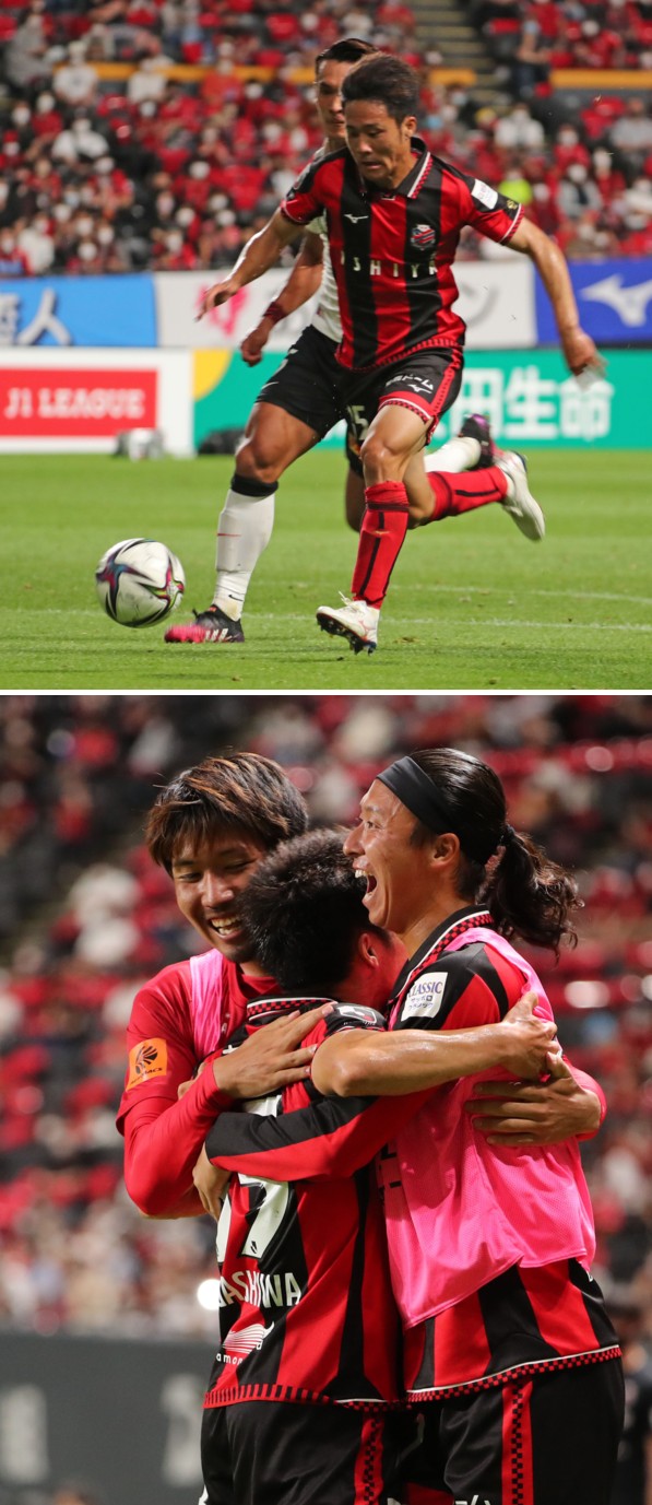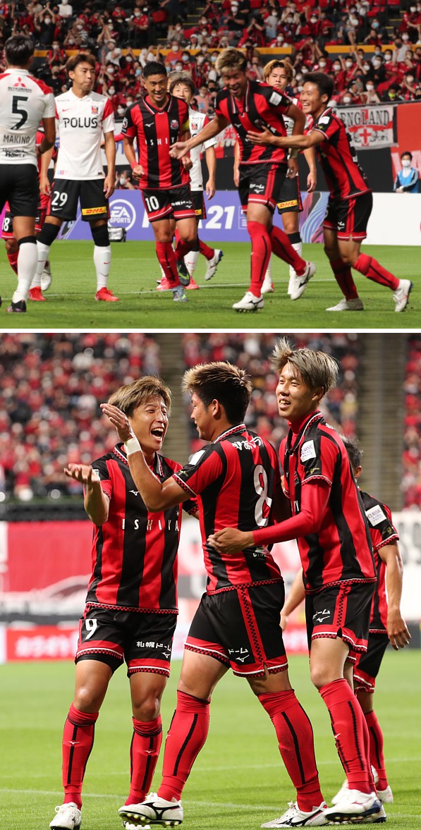 上:上段写真/前半8分、先制ゴールを決めた札幌MF深井(右から3人目)とFW小柏(右端)、MF宮澤(10番)が笑顔で喜び合う。浦和MF柴戸(29番)はぶぜんとした表情