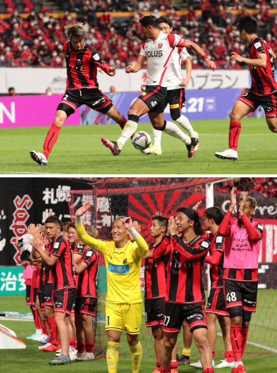 上:下段写真/試合後、札幌のサポーターへあいさつするGK菅野(1番)、MF荒野(27番)ら、久し振りの札幌ドームでの勝利に選手たちの笑顔がはじける