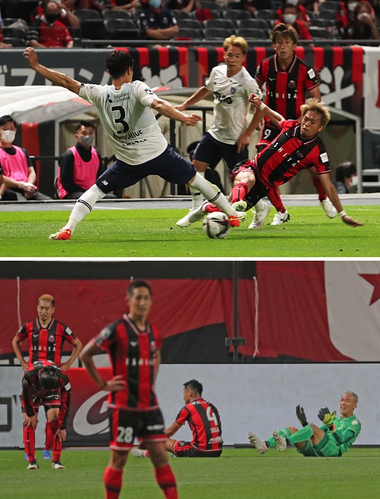 上:下段写真/前半45分、東京FWアダイウトンに2点目を決められ「ヤラレター」といった感じの札幌の選手たち、左から手前MF荒野、奥DF福森、MF青木(28番)、菅、GK菅野